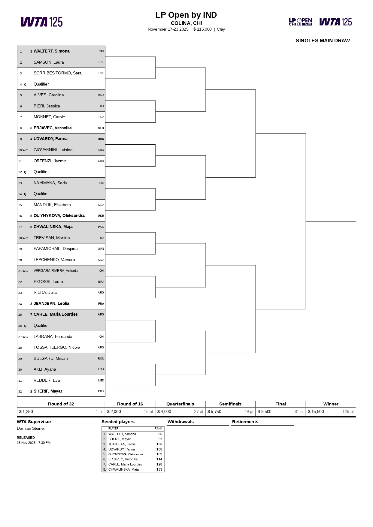 Este es el cuadro principal del WTA 125 de Colina 2025:
