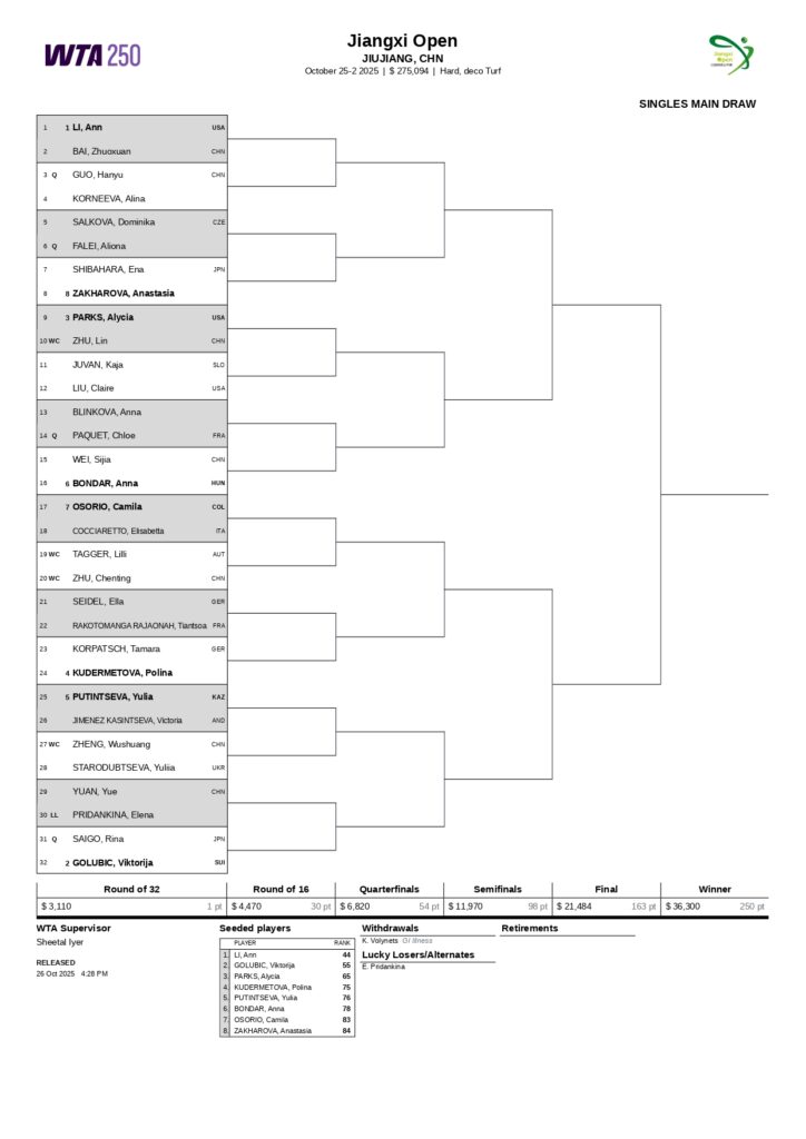 Dentro de las preclasificadas aparecen Alycia Parks, Polina Kudermetova, Yulia Putintseva, Anna Bondar y Camila Osorio, quien tendrá un complicado debut ante la italiana Elisabetta Cocciaretto.