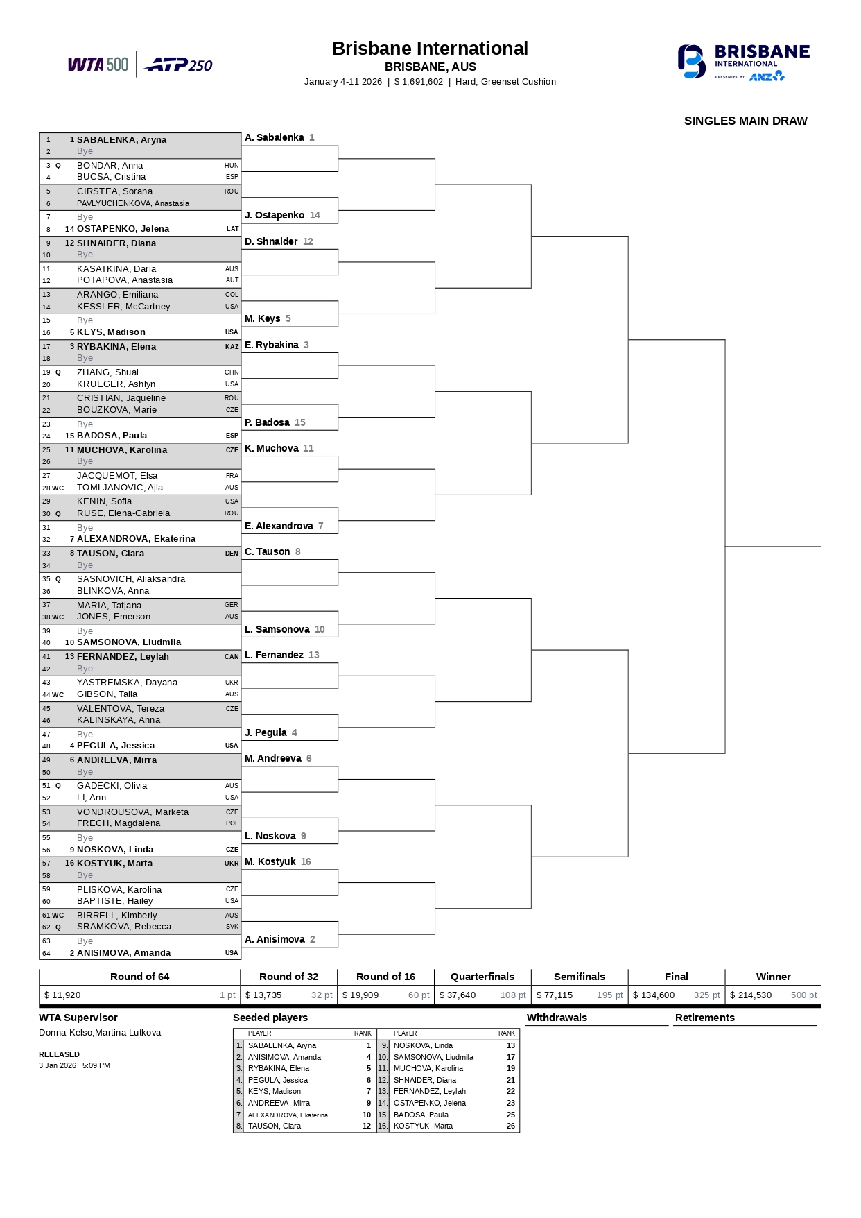 Este es el cuadro del WTA 500 de Brisbane 2026: