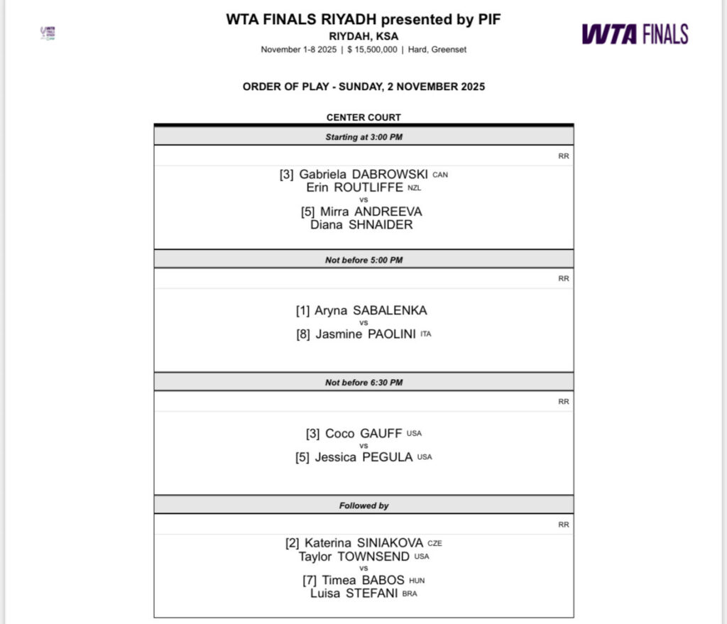 Este domingo continúa la acción de la WTA Finals 2025 y es momento del debut del Grupo ‘Stefi Graff’, donde Aryna Sabalenka es la principal candidata a quedar en el primer lugar y avanzar a las semifinales. En la primera fecha de round robin tendremos, como es costumbre, dos partidos de dobles y dos de sencillos.