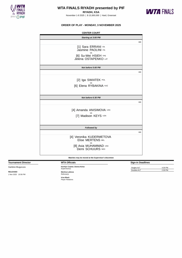 En el primer turno de sencillos se enfrentarán las ganadoras de la primera jornada, es decir, Iga Swiatek ante Elena Rybakina; mientras que a continuación se medirán las perdedoras de sábado: Madison Keys ante Amanda Anisimova.