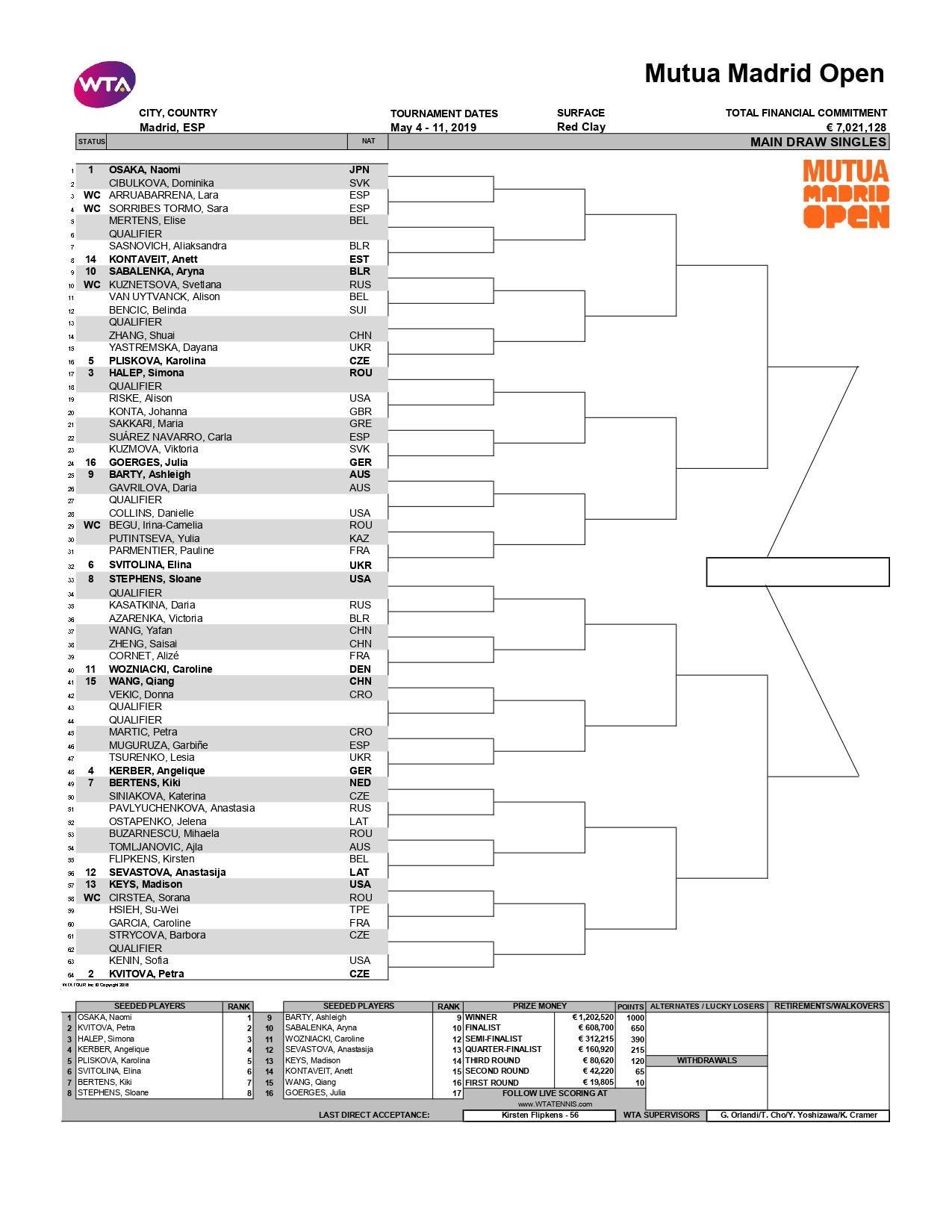 El segundo WTA Premier Mandatory del año: Madrid, ya tiene su cuadro principal. La capital española será epicentro de la lucha entre la japonesa Naomi Osaka y la rumana Simona Halep por ser número uno del mundo. Osaka enfrentará en primera ronda a la eslovaca Dominika Cibulkova y Halep aguarda por una qualifier.